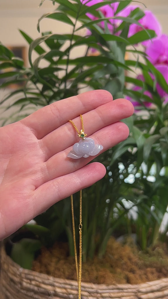 * Design Concept--- This necklace is made with very high-quality genuine Burmese icy lavender jadeite jade, intricately carved into a lotus flower. The jade texture is smooth and translucent with no natural lines or cloudy spots. The pendant is finished with an 18K yellow solid gold bail dazzled with an imperial green jade. Jadeite jade is one of the toughest gemstones, and it's believed to bring good luck. It's a perfect gift for you and your loved ones.