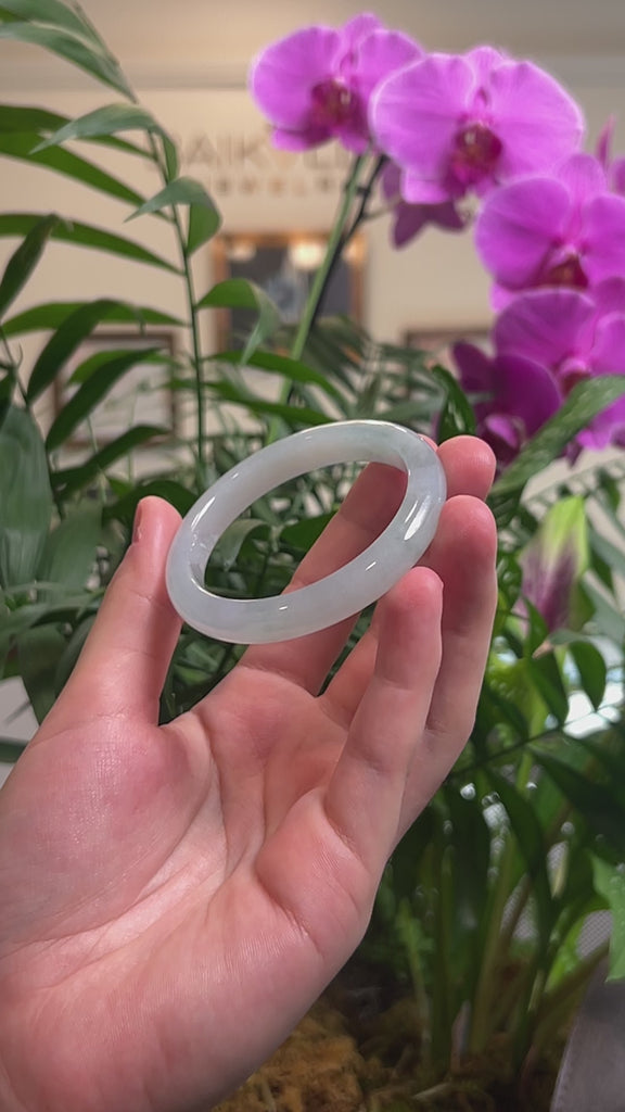 * DETAILS--- This bangle is crafted from genuine Burmese Jadeite jade that features a light icy green color throughout. The texture is silky smooth and translucent with no natural lines and or cloudy spots. It's a half round, comfort-fit bangle, which is flat on the inside and comfortable for everyday wear. Known for its durability, jadeite is also believed to bring good luck. This bangle makes a thoughtful and meaningful gift for yourself or someone special.