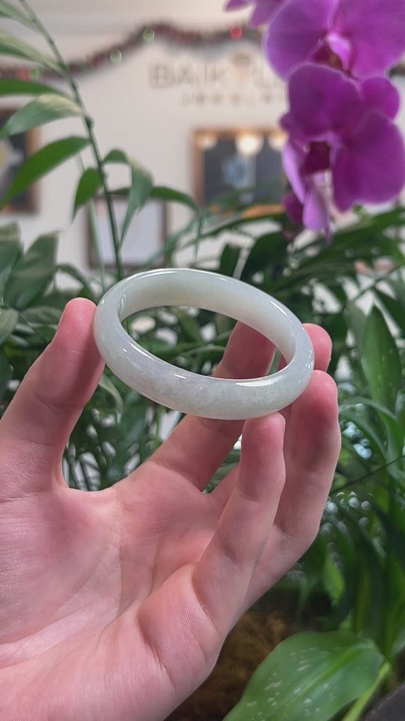 *DETAILS--- This oval bangle is crafted from high quality, natural Burmese Jadeite jade that features an icy light green color throughout. The jade texture is smooth and translucent with no natural lines and minimal cloudy spots. It's a half-round, comfort fit oval bangle that is flat on the inside, making it comfortable for everyday wear. Known for its durability, jadeite is also believed to bring good luck. Whether as a gift for yourself or a loved one, this jade bangle is a meaningful treasure that combines natural beauty, lasting craftsmanship, and exceptional value to cherish for years to come.