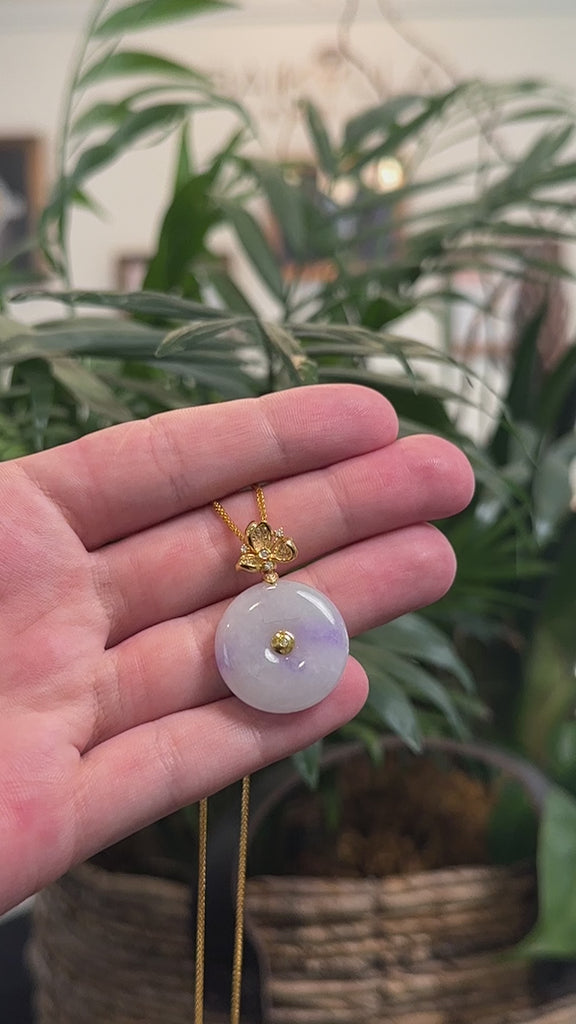 * Design Concept--- The Ping An Kou (Good Luck Button) is a Chinese symbol of peace, protection and well-being, believed to ward off negative energy and bring good fortune. This pendant is made with very high-quality genuine Burmese jadeite jade in an icy lavender color with vibrant vixen purple patches. The jade texture is smooth and semi-translucent in texture with no natural lines and minimal cloudy spots. The pendant features an 18K yellow gold bail in a flower design, dazzled with diamonds and a diamond center bezel set in gold. Gifting one of these is like wishing the best of luck to your family or loved ones.