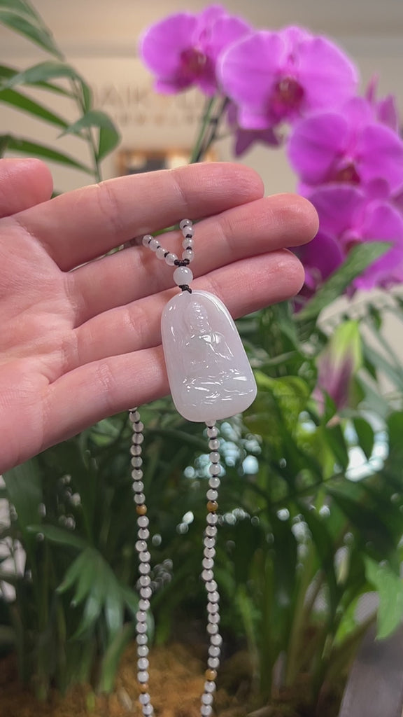 * Design Concept: This pendant is crafted with genuine, natural Burmese jadeite jade in an icy white color throughout with a faint green patch in the center. The pendant is finished with a multi-color icy white and brown-ish yellow jadeite jade beaded necklace. The pendant is designed in the shape of the Guan Yin "Goddess of Compassion, which symbolizes mercy, protection, and enlightenment. It is believed that Guan Yin watches over and blesses those who wear her image, offering guidance and peace. A meaningful gift for yourself or a loved one.