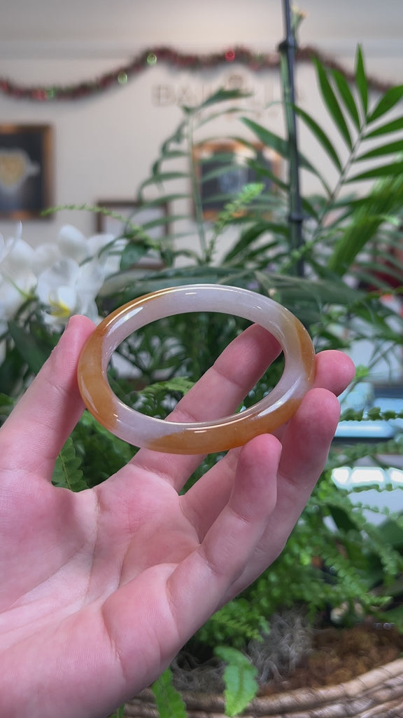 *DETAILS--- This bangle is crafted from fine-quality, natural Burmese Jadeite jade that features an icy, transparent texture and a white base color with large patches of rich orange color patches throughout. The texture is silky smooth and translucent with no natural lines and cloudy spots.