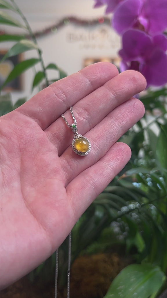 *Design concept-- “Shou Tao,” meaning Longevity Peach, comes from Chinese folklore, where peaches symbolize long life and good fortune. This pendant features an icy yellow natural Burmese jadeite jade carved in that classic form, set in 18K white gold and framed with natural diamonds. The 18K white gold bail includes additional diamonds and a small piece of imperial green jade for a subtle contrast. This is a one-of-a-kind piece and makes a meaningful, stylish gift for yourself or someone special.