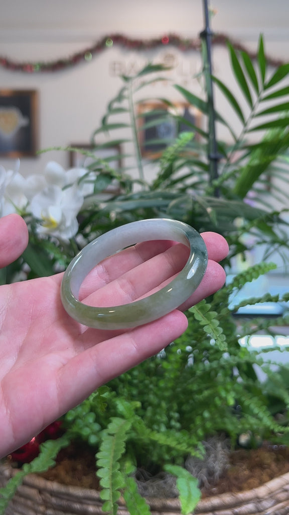 *DETAILS--- This oval bangle is crafted from fine-quality, natural Burmese Jadeite jade that features a light green and yellow-ish green color throughout, with a deep blue-green flower patch and small red-ish orange flowers. The jade texture is smooth and translucent with no natural lines and minimal cloudy spots. It's a half-round, comfort fit oval bangle that is flat on the inside, making it comfortable for everyday wear. Known for its durability, jadeite is also believed to bring good luck. Whether as a gift for yourself or a loved one, this jade bangle is a meaningful treasure that combines natural beauty, lasting craftsmanship, and exceptional value to cherish for years to come.