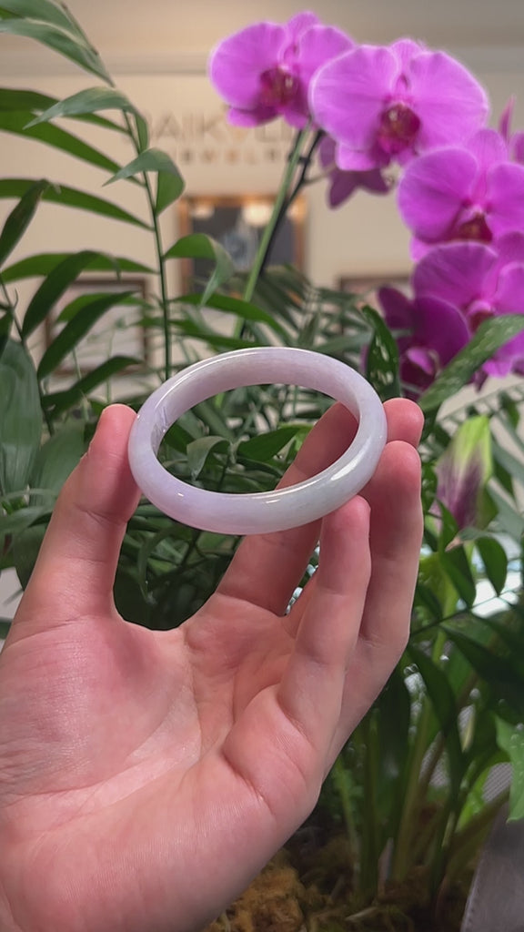 * DETAILS: This bangle is crafted from genuine Burmese Jadeite jade that features a blend of purple lavender and light green colors. The texture is smooth and translucent with no natural lines and cloudy spots. It's a half round, comfort-fit bangle, which is flat on the inside and comfortable for everyday wear. Known for its durability, jadeite is also believed to bring good luck. This bangle makes a thoughtful and meaningful gift for yourself or someone special.