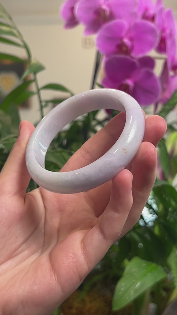 *DETAILS--- This bangle is crafted from genuine Burmese Jadeite jade that features a a lavender color throughout, with patches of light green and a small speck of orange Sajin (Golden Dust). The texture is smooth and translucent with minimal natural lines and cloudy spots.