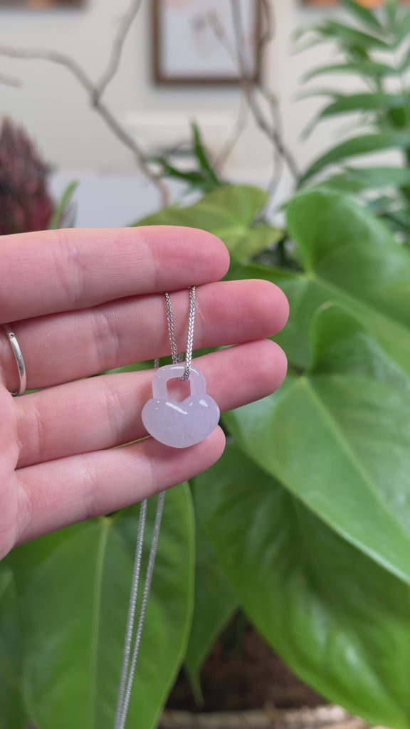 * Design Concept--- Introducing Baikalla's Lavender Jadeite Jade Lock Necklace Pendant. This necklace is shaped like a lock symbolizing security and commitment. The ice texture of jadeite jade is semi smooth with unique light lavender color. Perfect heart shape for you or your loved one.
