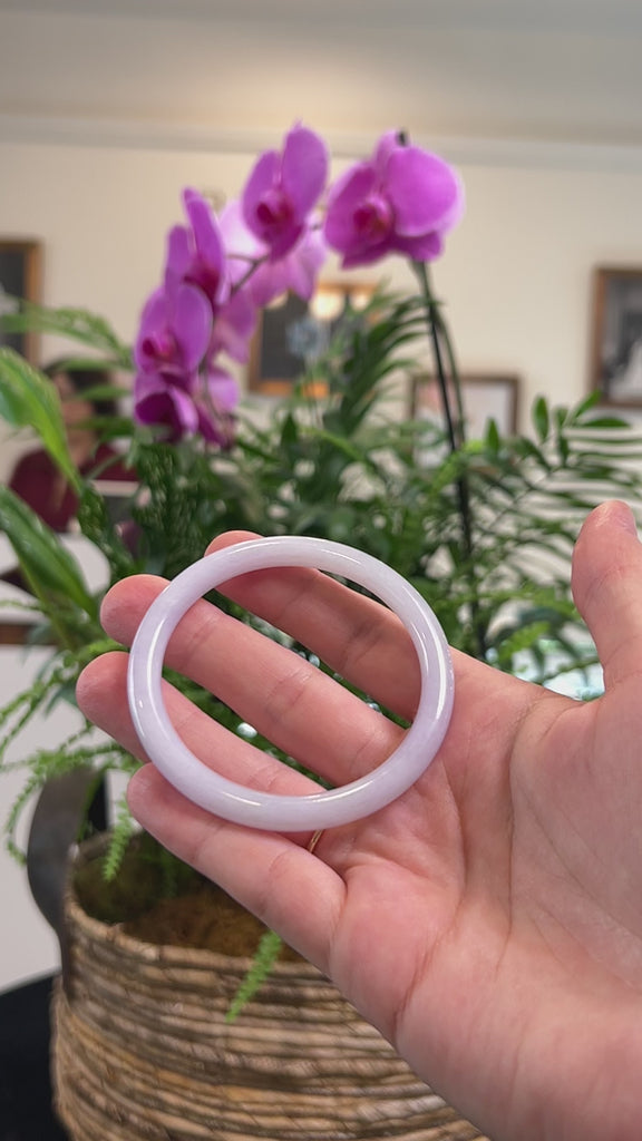 * DETAILS---This bangle is crafted from genuine Burmese Jadeite jade that features a light lavender color throughout. The texture is smooth and translucent with some natural lines and cloudy spots that reflects the jade’s genuine character. This bangle has a more narrow width, creating an elegant look.