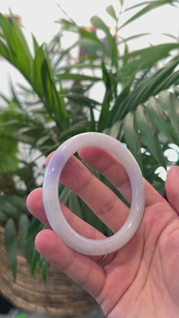 * DETAILS--- This bangle is crafted from genuine Burmese Jadeite jade. It features a semi smooth, translucent texture with light color base and a vibrant lavender patch. This bangle has some natural lines of color and a little cloudy throughout. The bangle has a beautiful blend of lavender and light green. It's a full round, traditional fit bangle, which gives a more dainty, petite look for everyday wear. Known for its durability, jadeite is also believed to bring good luck. This bangle makes a thoughtful and meaningful gift for yourself or someone special.