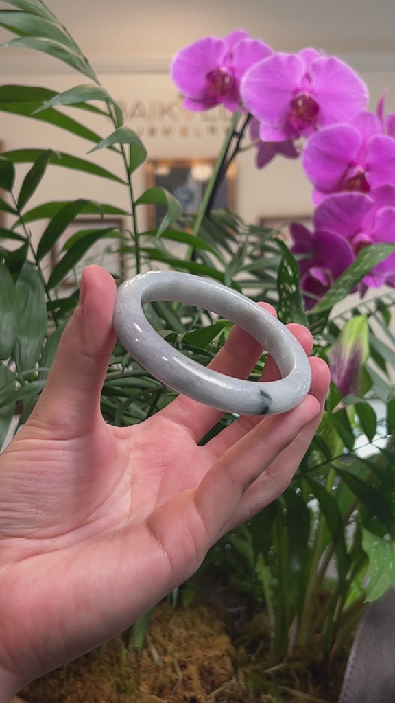 * DETAILS--- This bangle is crafted from genuine Burmese Jadeite jade that features a light blue-green color throughout with a patch of grey-ish smoky lavender and dark blue-green flowers. The texture is smooth and translucent with some natural lines and cloudy spots that reflects the jade’s genuine character. These organic features also make this piece more accessible and affordably priced, offering exceptional beauty and value.