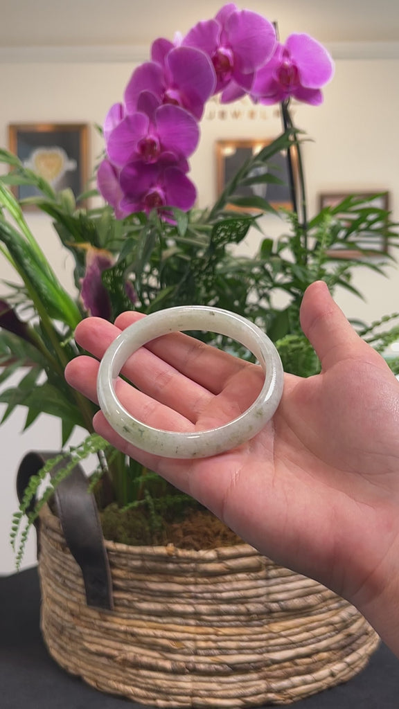 * DETAILS--- This bangle is crafted from genuine Burmese Jadeite jade. It features a light green and white color throughout with specks of darker green that add a unique look. The texture is smooth and translucent with some natural lines and cloudy spots that reflects the jade’s genuine character.