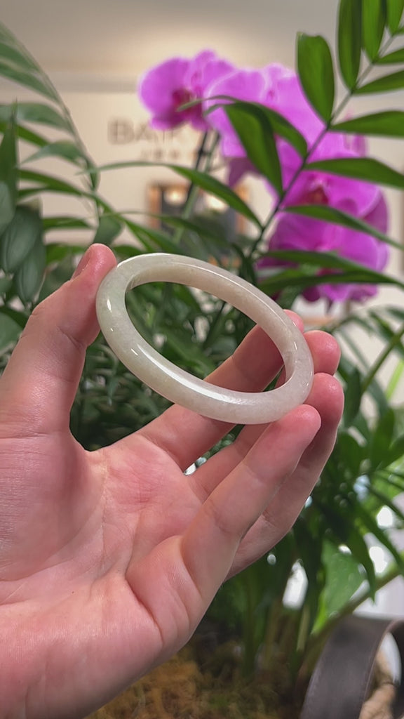 * DETAILS--- Genuine Burmese Jadeite Jade Oval Bangle Bracelet. This oval bangle features a light green color on one side and white on the other. The texture is smooth and translucent with minimal lines and cloudy spots. Designed in a half round comfort fit style, this oval bangle is flat on the inside and comfortable for everyday wear. This bangle is more narrow in width than standard, creating a more dainty look. Known for its durability, jadeite is also believed to bring good luck. This bangle makes a thoughtful and meaningful gift for yourself or someone special.