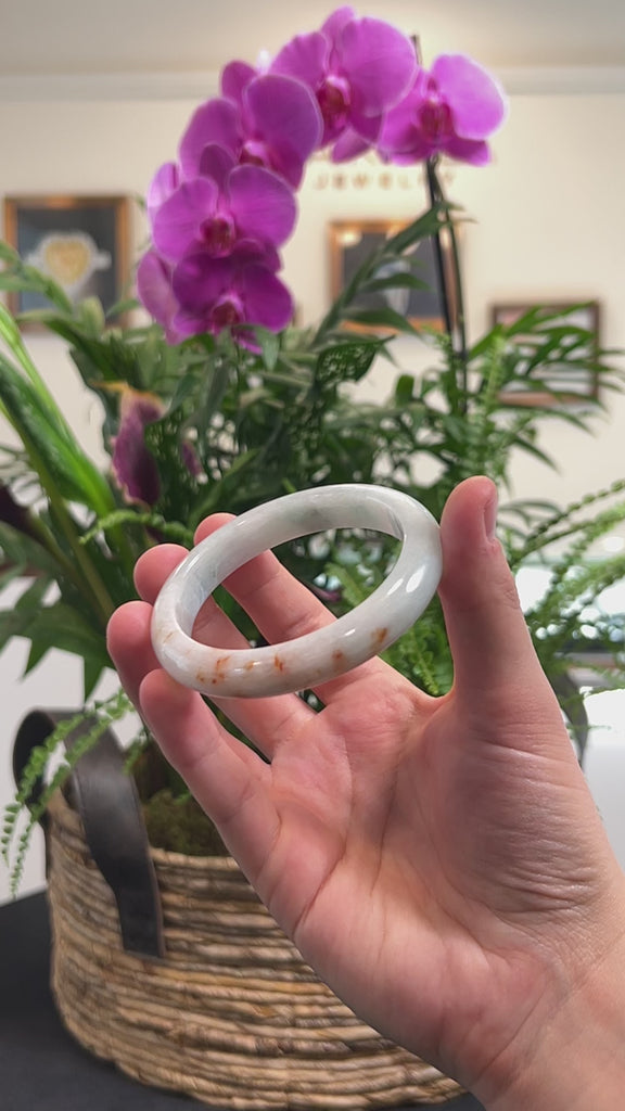 * DETAILS--- This bangle is crafted from genuine Burmese Jadeite jade. It features a smooth, translucent texture with a combination of light green and white with patches of SaJin "Golden Dust" flower that adds to it's unique and natural beauty. The texture is smooth with some natural lines and minimal cloudiness that are part of the jades natural uniqueness and is more affordable. It's a half round, comfort-fit bangle, which is flat on the inside of the bangle and comfortable for everyday wear. Known for its durability, jadeite is also believed to bring good luck. This bangle makes a thoughtful and meaningful gift for yourself or someone special.
