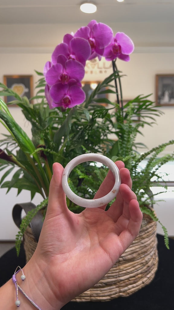 * DETAILS--- This bangle is crafted from genuine Burmese Jadeite jade. It features a combination of green and white colors with SaJin "Golden Dust" flower that adds to it's unique and natural beauty. The texture is smooth with some natural lines and minimal cloudy spots that are part of the jades natural uniqueness and is more affordable. It's a half round, comfort-fit bangle, which is flat on the inside of the bangle and comfortable for everyday wear. Known for its durability, jadeite is also believed to bring good luck. This bangle makes a thoughtful and meaningful gift for yourself or someone special.