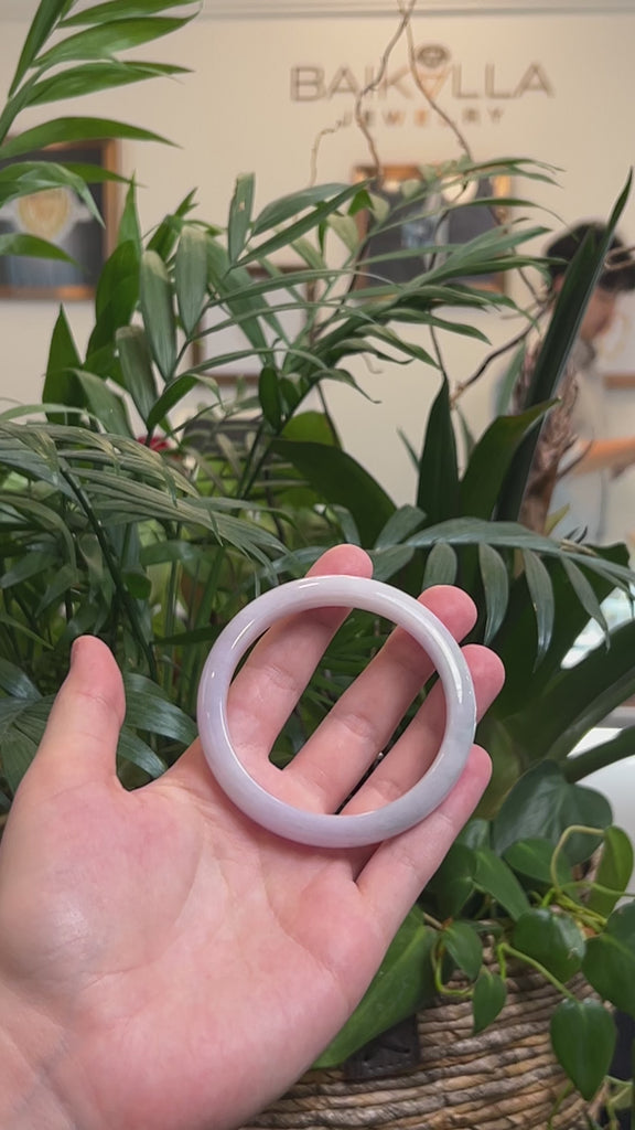 * DETAILS--- This bangle is crafted from genuine Burmese Jadeite jade. It features a semi-smooth, semi-translucent texture. The color is a beautiful light lavender mostly on one side and a white color with patches of green on the other side, highlighting its natural beauty and uniqueness. This bangle has minimal natural lines and some cloudy spots. It's a half round, comfort-fit bangle, which is flat on the inside of the bangle and comfortable for everyday wear. Known for its durability, jadeite is also believed to bring good luck. This bangle makes a thoughtful and meaningful gift for yourself or someone special.