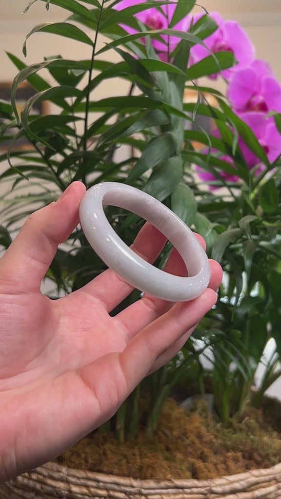 * DETAILS--- This bangle is crafted from genuine Burmese Jadeite jade that features a light lavender grey Wuji color(乌鸡) "black chicken" on one side and a light green color on the other. The texture is smooth with no natural lines and minimal cloudy spots, including a small orange Sajin(Golden Dust) speck that reflects the jade’s natural character.