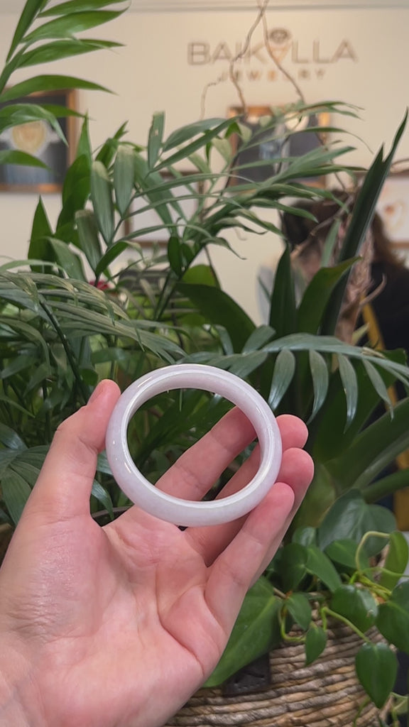 * DETAILS--- This bangle is crafted from genuine Burmese Jadeite jade. It features a semi smooth, semi translucent texture. The color is a beautiful light lavender color throughout with a very small green patch and Wuji speck on the inside of the bangle, highlighting its natural beauty and uniqueness. This bangle has minimal natural lines and some cloudy spots. It's a half round, comfort-fit bangle, which is flat on the inside of the bangle and comfortable for everyday wear. Known for its durability, jadeite is also believed to bring good luck. This bangle makes a thoughtful and meaningful gift for yourself or someone special.