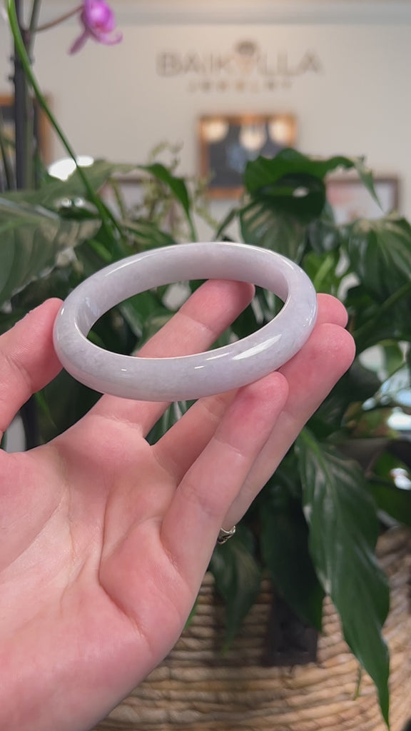 *DETAILS--- This bangle is crafted from natural Burmese Jadeite jade that features a light lavender color throughout, with small faint green patches that add a unique look. The texture is semi-smooth and translucent with minimal natural lines and cloudy spots that showcase the jade's genuine character. Designed in a half-round, comfort-fit style, the bangle is flat on the inside for a comfortable feel, perfect for everyday wear. Known for its durability, jadeite is also cherished as a symbol of good luck, protection, and harmony. Whether as a gift for yourself or a loved one, this jade bangle is a meaningful treasure that combines natural beauty, lasting craftsmanship, and exceptional value to cherish for years to come.