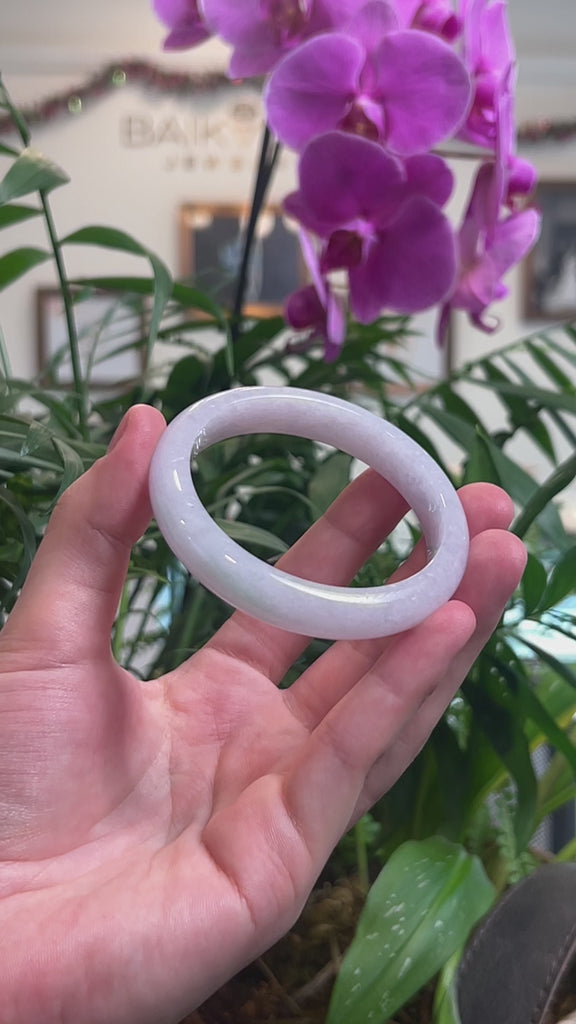 *DETAILS--- This bangle is crafted from natural Burmese Jadeite jade that features a light lavender color throughout with a light green patch. The texture is smooth and translucent with no natural lines and some cloudy spots. Designed in a half-round, comfort-fit style, the bangle is flat on the inside for a comfortable feel, perfect for everyday wear. Known for its durability, jadeite is also cherished as a symbol of good luck, protection, and harmony. Whether as a gift for yourself or a loved one, this jade bangle is a meaningful treasure that combines natural beauty, lasting craftsmanship, and exceptional value to cherish for years to come.