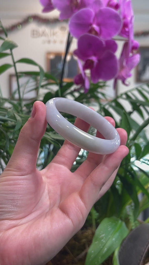 * DETAILS--- This bangle is crafted from natural Burmese Jadeite jade that features a light lavender color throughout with a light yellow patch and light black Wuji flecks. Wuji (乌鸡), meaning “black chicken,” refers to the distinctive blackish-grey coloration prized in jadeite. The texture is semi-smooth and translucent with no natural lines and minimal cloudy spots.