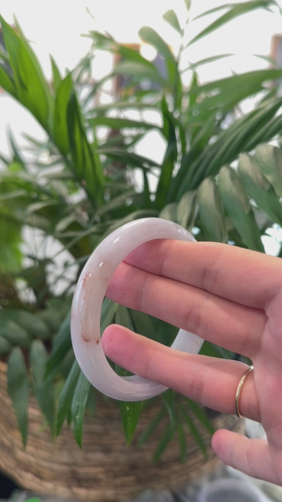 * DETAILS--- Genuine Burmese Jadeite Jade Bangle Bracelet. This bangle features a soft light lavender color and a smooth, translucent texture with SaJin "Golden Dust" specks that looks very beautiful and unique. Has a little natural lines and cloudy texture. It's a half round, comfort-fit bangle, which is flat on the inside of the bangle and comfortable for everyday wear. Known for its durability, jadeite is also believed to bring good luck. This bangle makes a thoughtful and meaningful gift for yourself or someone special.