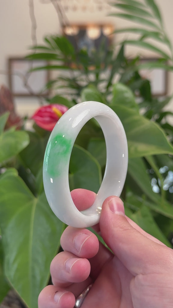 * DETAILS--- This bangle is crafted from genuine Burmese Jadeite jade. It features a smooth, translucent texture with a rich green over a white base color that looks very luxurious. It's a very classic and prized color-way. Known as the "Moss in Snow" It's a half round, comfort-fit bangle, which is flat on the inside of the bangle and comfortable for everyday wear. Known for its durability, jadeite is also believed to bring good luck. This bangle makes a thoughtful and meaningful gift for yourself or someone special.
