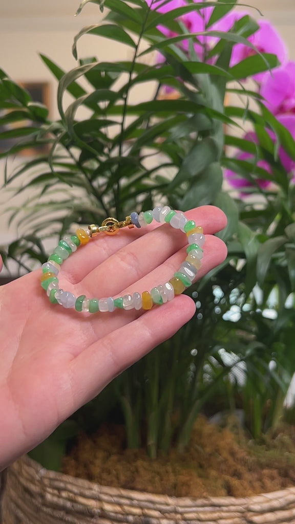 * DETAILS---This bracelet is made with fine quality, natural genuine Burmese jadeite jade beads in a mix of green, lavender, yellow, and white colors that are in a free-form shape. The bracelet is finished with an 18k yellow gold clasp with a milgrain finish, creating a sparkling effect on the gold. Known for its durability, jadeite is also believed to bring good luck. Whether as a gift for yourself or a loved one, this jade beaded bracelet is a meaningful piece.