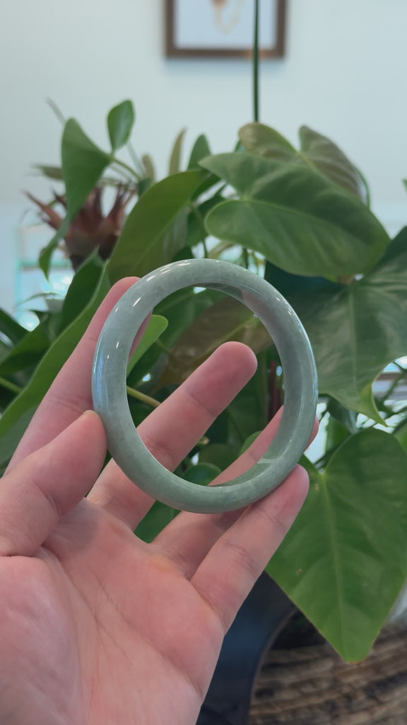 * DETAILS--- Genuine Burmese Jadeite Jade Bangle Bracelet. This bangle is made with even green genuine Burmese Jadeite jade. The jade texture is fine and semi translucent. With some natural cloudy spots. The bangle has some very beautiful green color through out. The green and lavender color and ice texture, truly a mesmerizing combination. The Classic half round style bracelet.