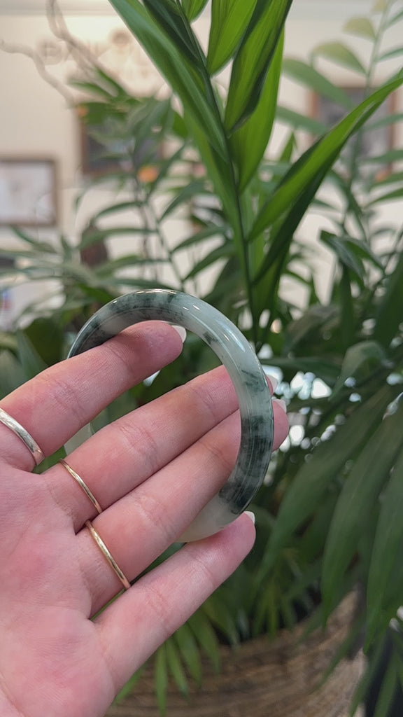 * DETAILS--- This beautiful bangle is made from natural Burmese Jadeite jade, featuring very smooth texture, with beautiful dark blue colors through out. Overall a white base color. It's a full round, traditional fit bangle, which gives the bangle a more dainty, petite look for everyday wear. This bangle has very few visible texture, overall very smooth and no natural lines. This is really nice color to come by for Burmese jadeite jade. A timeless piece, perfect as a thoughtful gift for yourself or someone truly special.