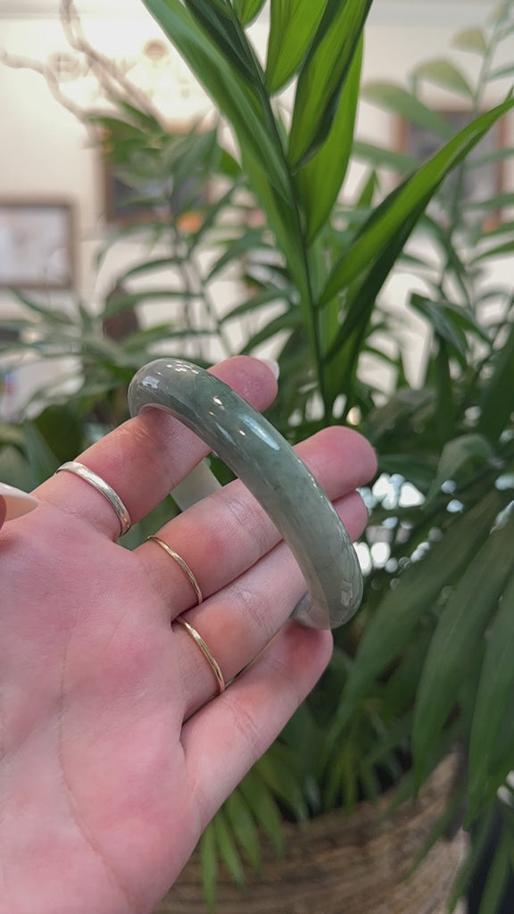 * DETAILS--- This beautiful jadeite bangle is made from natural Burmese Jadeite jade, featuring a semi smooth texture. With a darker green tone through out. With a patch of lavender color. It's a half round, comfort-fit bangle, which is flat on the inside of the bangle and comfortable for everyday wear. Overall with some cloudy spots and no natural lines. A timeless piece, perfect as a thoughtful gift for yourself or someone truly special.