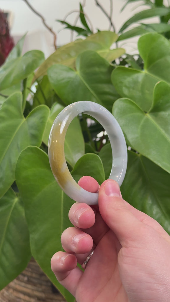 * DETAILS---This stunning jade bangle is crafted from fine Burmese jadeite with a beautiful yellow and blue green hue. Its smooth texture and timeless elegance make it a true standout. The classic half-round shape ensures a comfortable fit while showcasing the natural beauty of the jade. With its unique look, the natural jade bangle is not just a piece of fine jewelry, but also a meaningful gift — perfect for yourself or someone special.