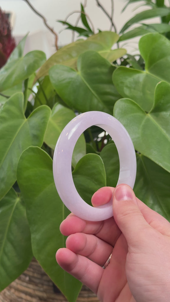 * DETAILS---Embrace the refined beauty of this exquisite jade bangle, masterfully carved from top-grade Burmese jadeite in a delicate pink-lavender hue. Its smooth, icy texture exudes sophistication and purity, while the classic half-round shape offers both elegance and comfort. Radiating timeless charm and quiet luxury, this bangle is more than a piece of jewelry — it’s a symbol of grace, strength, and heartfelt blessings. A treasured gift for yourself or someone truly special.