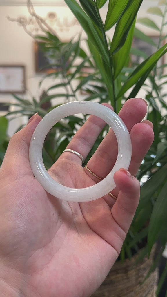 * DETAILS--- This beautiful bangle is made from natural Burmese Jadeite jade, featuring a smooth, icy texture and an overall white color with a patch of very faint green color. It's a full round, traditional fit bangle, which gives the bangle a more dainty, petite look for everyday wear. This bangle has very few visible texture, overall very smooth and no natural lines. A timeless piece, perfect as a thoughtful gift for yourself or someone truly special.