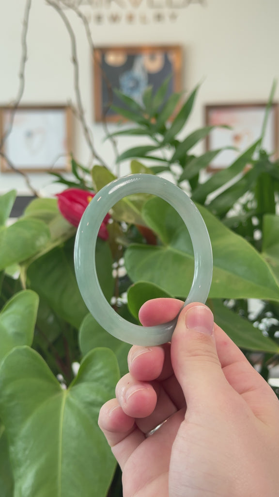 * DETAILS--This high-end exquisite bangle is crafted from premium Burmese jadeite, showcasing a beautiful translucent oil green color. Its smooth texture and timeless design exude elegance. The petite traditional style perfectly highlights the natural beauty of the jade, making it a versatile and stylish piece. A meaningful and thoughtful gift — perfect for yourself or someone truly special.