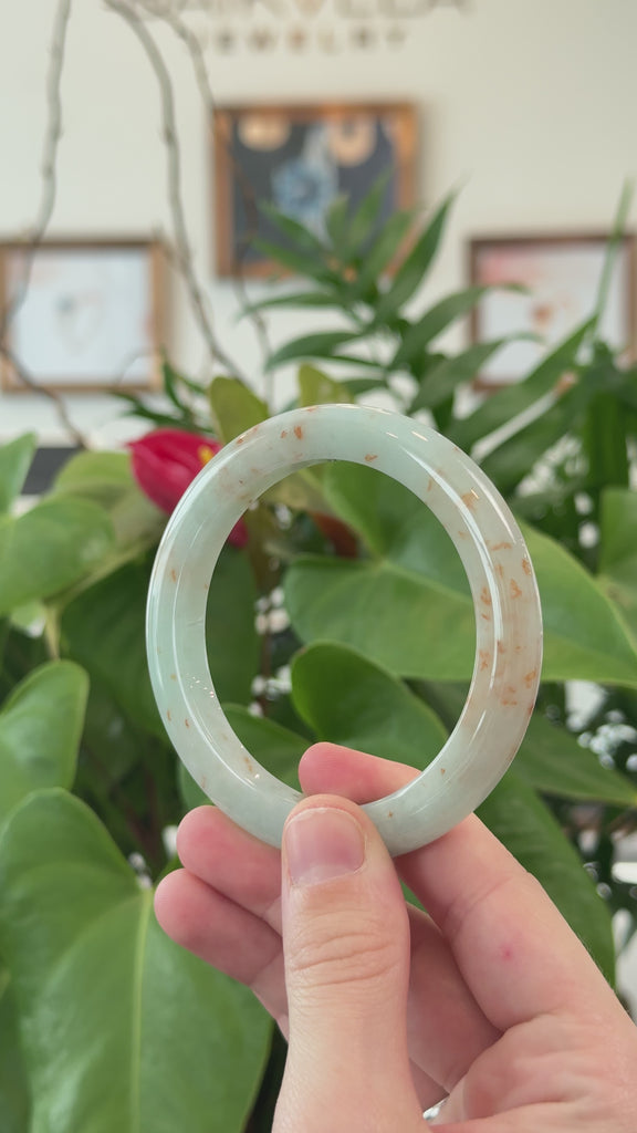 * DETAILS--This bangle is made from genuine Burmese Jadeite jade. It has a translucent texture with a light green tone throughout the bangle and red freckle pattern. This bangle catches your eye with its unique color. With some small cloudy spots. The classic half-round design offers comfort and style. Jadeite jade is one of the toughest gemstones, and it's believed to bring good luck. This bangle makes a special gift for you or a loved one.