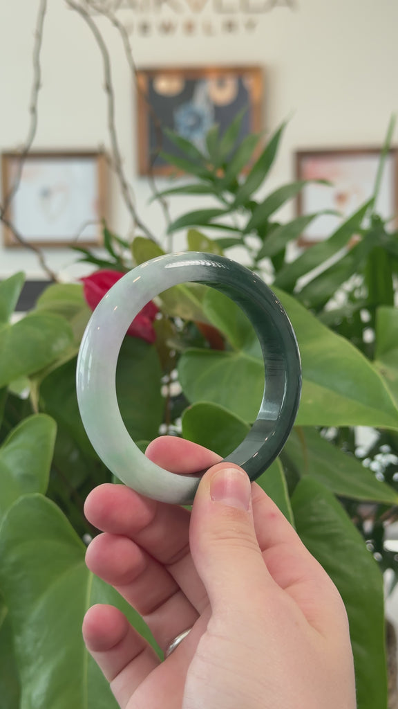 * DETAILS-- This bracelet is crafted from quality, genuine Burmese Jadeite Jade with a mix of light lavender and green tones. The jade’s texture is very smooth and half and half style featuring patches of light lavender and green color mostly on one side and a deep green on the other. The bangle has a stunning, unique color pattern that catches the eye. The bangle has a classic half-round style that enhances its elegance also offers comfort, making it a perfect piece for jade lovers and collectors alike.