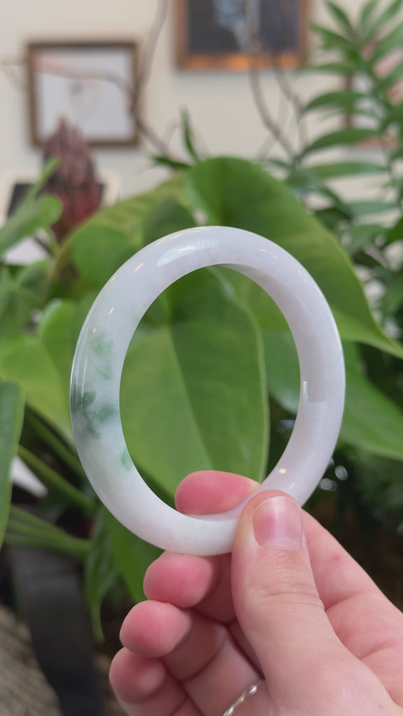 * DETAILS--- This Genuine Burmese Jadeite Jade Bangle Bracelet is crafted from high-quality green Jadeite jade. The fine, translucent texture is highlighted by patches of deeper blue-green lavender hues, creating a unique and mesmerizing look. The stunning shades of blue-green make this bangle truly stand out. Its classic half-round style adds an elegant touch, making it a timeless piece for any collection. It's also a special gift for yourself or a loved one.