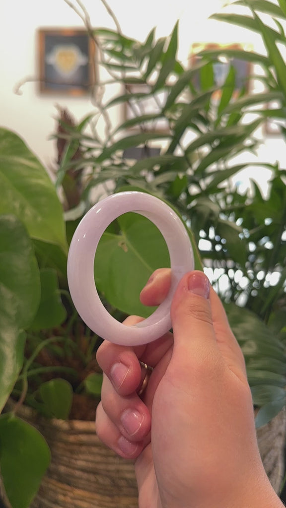 * DETAILS--- This beautiful jadeite bangle is made from natural Burmese Jadeite jade, featuring very smooth, light icy texture, with beautiful gentle, even white to light lavender color through out. It's a half round, comfort-fit bangle, which is flat on the inside of the bangle and comfortable for everyday wear. Overall with no cloudy spots and no natural lines. This is really unique color to come by for Burmese jadeite jade. A timeless piece, perfect as a thoughtful gift for yourself or someone truly special.