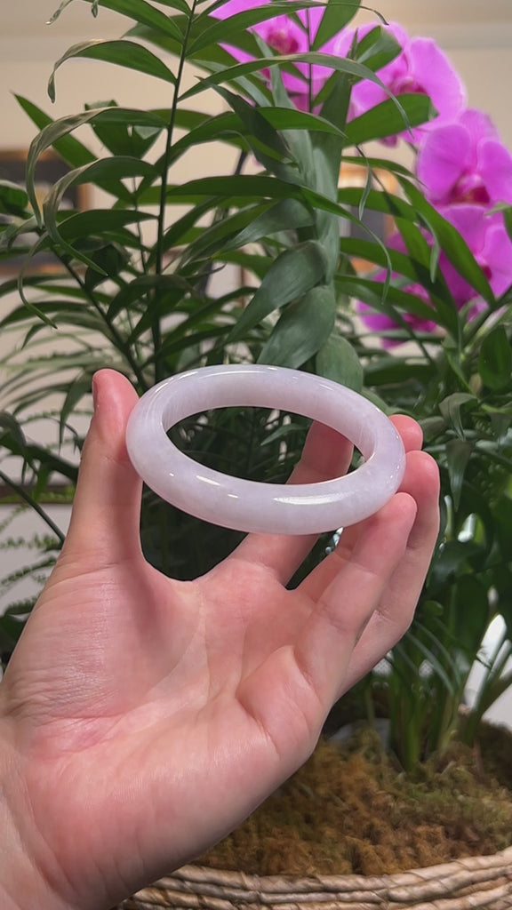 * DETAILS--- This bangle is crafted from genuine Burmese Jadeite jade that features a light lavender color throughout and very faint black Wuji "black chicken" specks. The texture is smooth and translucent with minimal natural lines and very minimal cloudy spots. Designed in a half-round, comfort-fit style, the bangle is flat on the inside for a comfortable feel, perfect for everyday wear. Known for its durability, jadeite is also cherished as a symbol of good luck, protection, and harmony. Whether as a gift for yourself or a loved one, this jade bangle is a meaningful treasure that combines natural beauty, lasting craftsmanship, and exceptional value to cherish for years to come.
