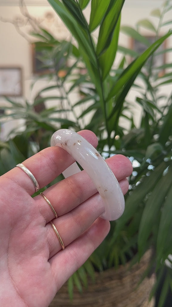 * DETAILS--- This beautiful jadeite bangle is made from natural Burmese Jadeite jade, featuring very smooth, light icy texture, with beautiful gentle, even white to light lavender color through out with some SaJin Flower. It's a half round, comfort-fit bangle, which is flat on the inside of the bangle and comfortable for everyday wear. Overall with no cloudy spots and no natural lines. This is really unique color to come by for Burmese jadeite jade. A timeless piece, perfect as a thoughtful gift for yourself or someone truly special.