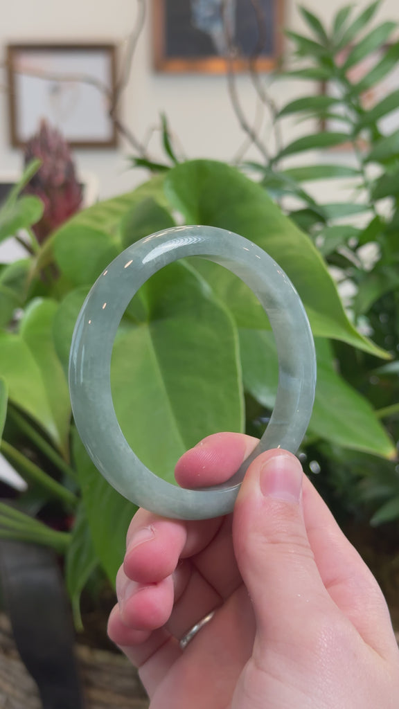 * DETAILS--- This beautiful bangle is made from premium Burmese Jadeite jade, featuring a smooth texture and a oil-green color. Its classic half-round design highlights its natural beauty and ensures a comfortable fit, It's a bigger size. A timeless piece, perfect as a thoughtful gift for yourself or someone truly special.