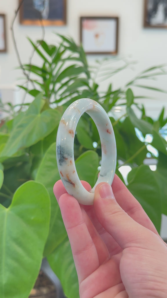 * DETAILS--- This beautiful bangle is crafted from premium Burmese Jadeite, featuring vibrant blue red spots that glow like golden embers. Its smooth, translucent texture and classic half-round design highlight the jade’s natural beauty with elegance. Just has little natural stone line. A rare and meaningful collectible, it makes a thoughtful gift for yourself or someone special.