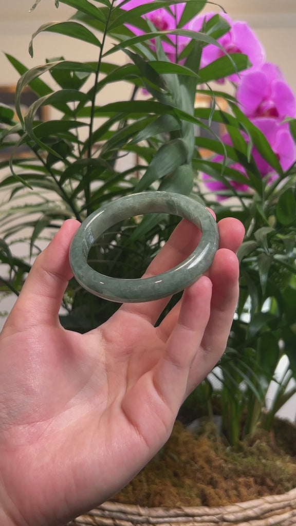 * DETAILS--- This bangle is crafted from genuine Burmese Jadeite jade that features a blend of light and dark oil-green colors throughout. The texture is smooth and translucent with minimal natural lines and cloudy spots. Designed in a half-round, comfort-fit style, the bangle is flat on the inside for a comfortable feel, perfect for everyday wear. Known for its durability, jadeite is also cherished as a symbol of good luck, protection, and harmony. Whether as a gift for yourself or a loved one, this jade bangle is a meaningful treasure that combines natural beauty, lasting craftsmanship, and exceptional value to cherish for years to come.