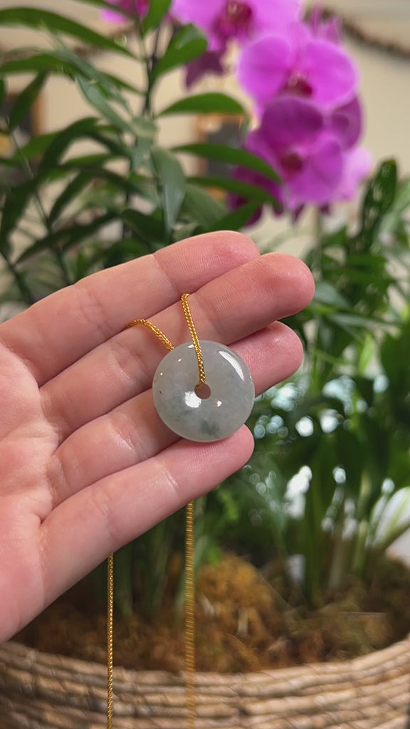 * Design Concept--- The Ping An Kou (Good Luck Button) is a Chinese symbol of peace, protection and well-being, believed to ward off negative energy and bring good fortune. This pendant is made with natural Burmese jadeite jade that features an icy light blue-green color throughout with small flecks of red-ish orange Sajin (Golden Dust). Known for its durability, jadeite is also believed to bring good luck. Gifting one of these is like wishing the best of luck to your family or loved ones.