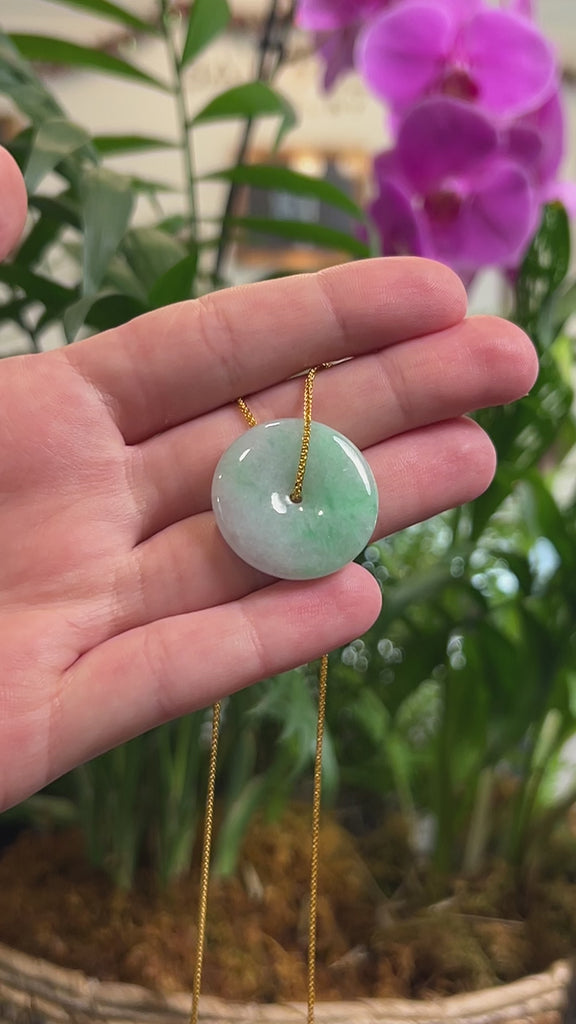 * Design Concept--- The Ping An Kou (Good Luck Button) is a Chinese symbol of peace, protection and well-being, believed to ward off negative energy and bring good fortune. This pendant is made with natural Burmese jadeite jade that features a vibrant green and white color gradient. Known for its durability, jadeite is also believed to bring good luck. Gifting one of these is like wishing the best of luck to your family or loved ones.