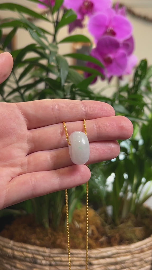 * Design Concept--- The Ping An Kou (Good Luck Button) is a Chinese symbol of peace, protection and well-being, believed to ward off negative energy and bring good fortune. This pendant is made with natural Burmese jadeite jade that features a soft white color throughout with a vibrant green fleck. Known for its durability, jadeite is also believed to bring good luck. Gifting one of these is like wishing the best of luck to your family or loved ones.