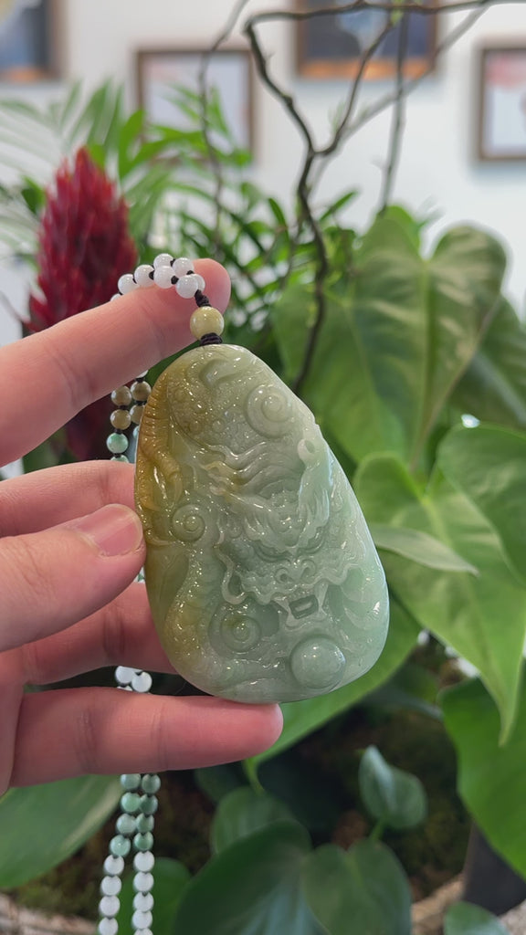 Design concept: This exquisite dragon pendant is crafted from green yellow jadeite jade, featuring a smooth, transparent finish. The intricate design showcases a majestic dragon by yellow jade, It's so unique, a powerful symbol of good fortune and success, making it a popular motif in art and jewelry. This pendant is both a stunning accessory and a thoughtful gift for yourself or a cherished loved one.