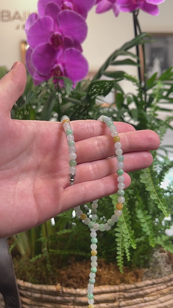 * DETAILS---This necklace is made with fine quality, genuine Burmese jadeite jade beads in a mix of green, yellow, and white colors (colors may vary, sent at random). The jade texture is so smooth and translucent. Known for its durability, jadeite is also believed to bring good luck. Whether as a gift for yourself or a loved one, this jade beaded necklace is a meaningful piece.