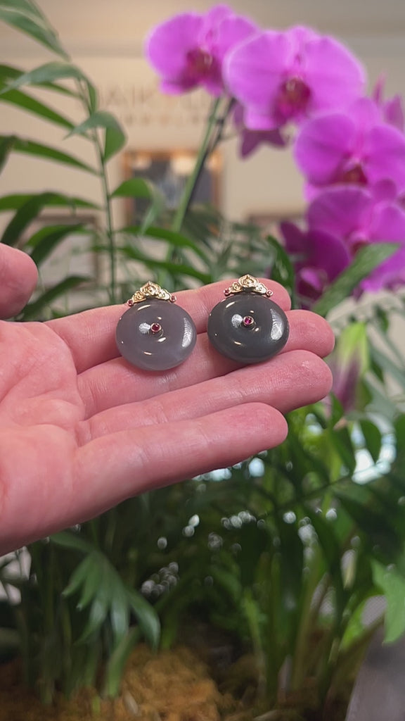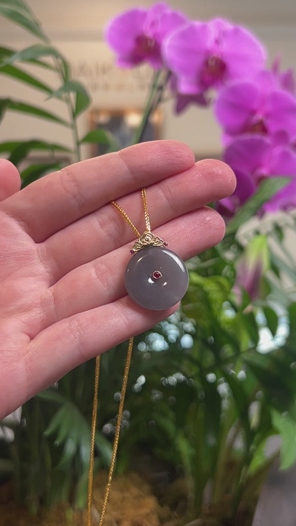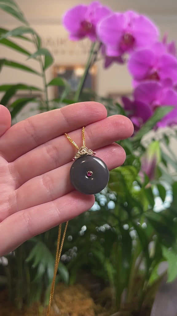 *Design Concept: The Ping An Kou (Good Luck Button) is a Chinese symbol of peace, protection and well-being, believed to ward off negative energy and bring good fortune. This pendant is made with very high-quality genuine Nephrite jade in a dark smoky grey-ish purple color throughout. The pendant features an 18K yellow gold bail that is dazzled with tourmaline. Gifting this piece is a heartfelt way to wish your family or loved ones good luck, peace, and protection.