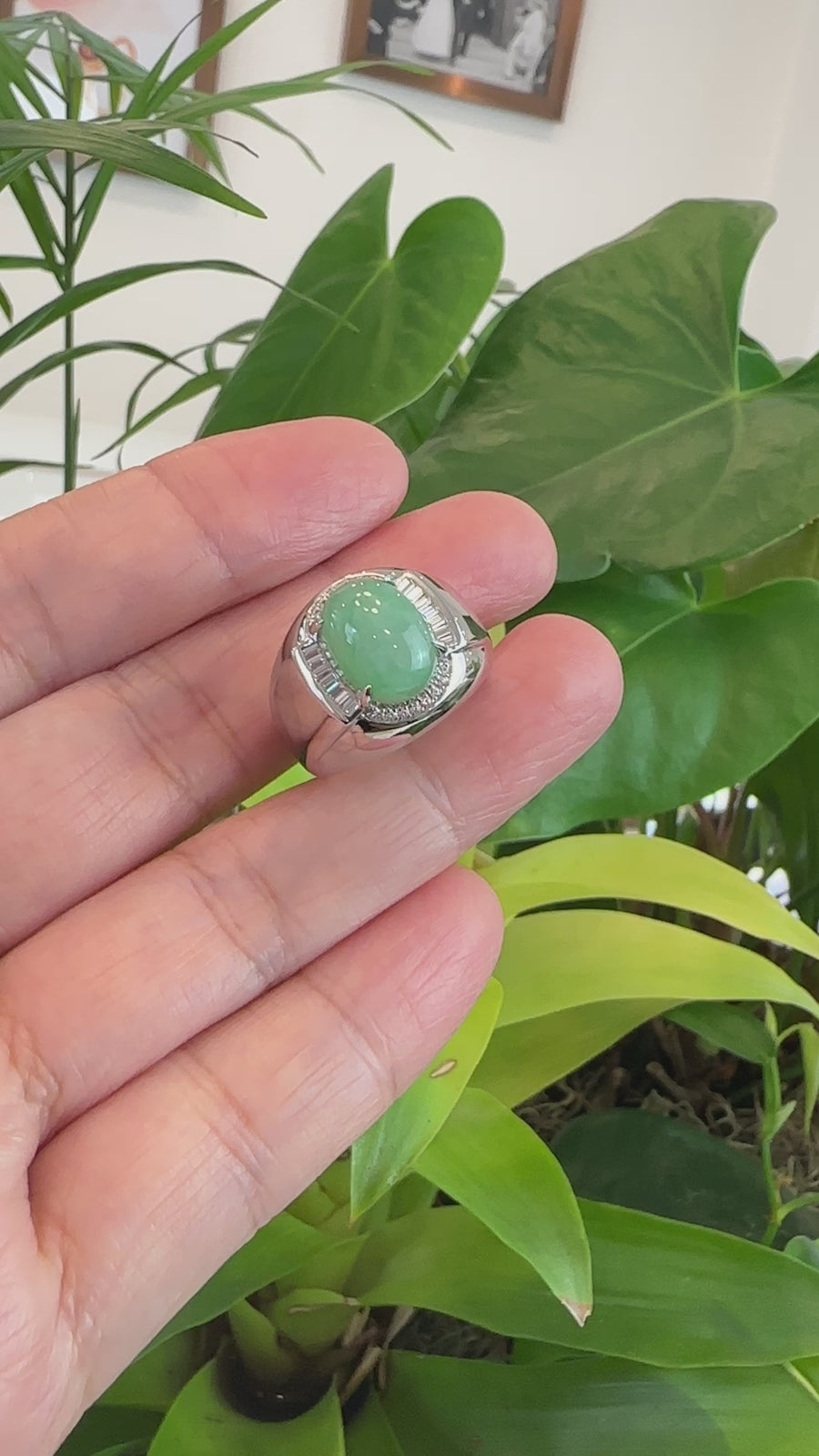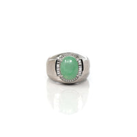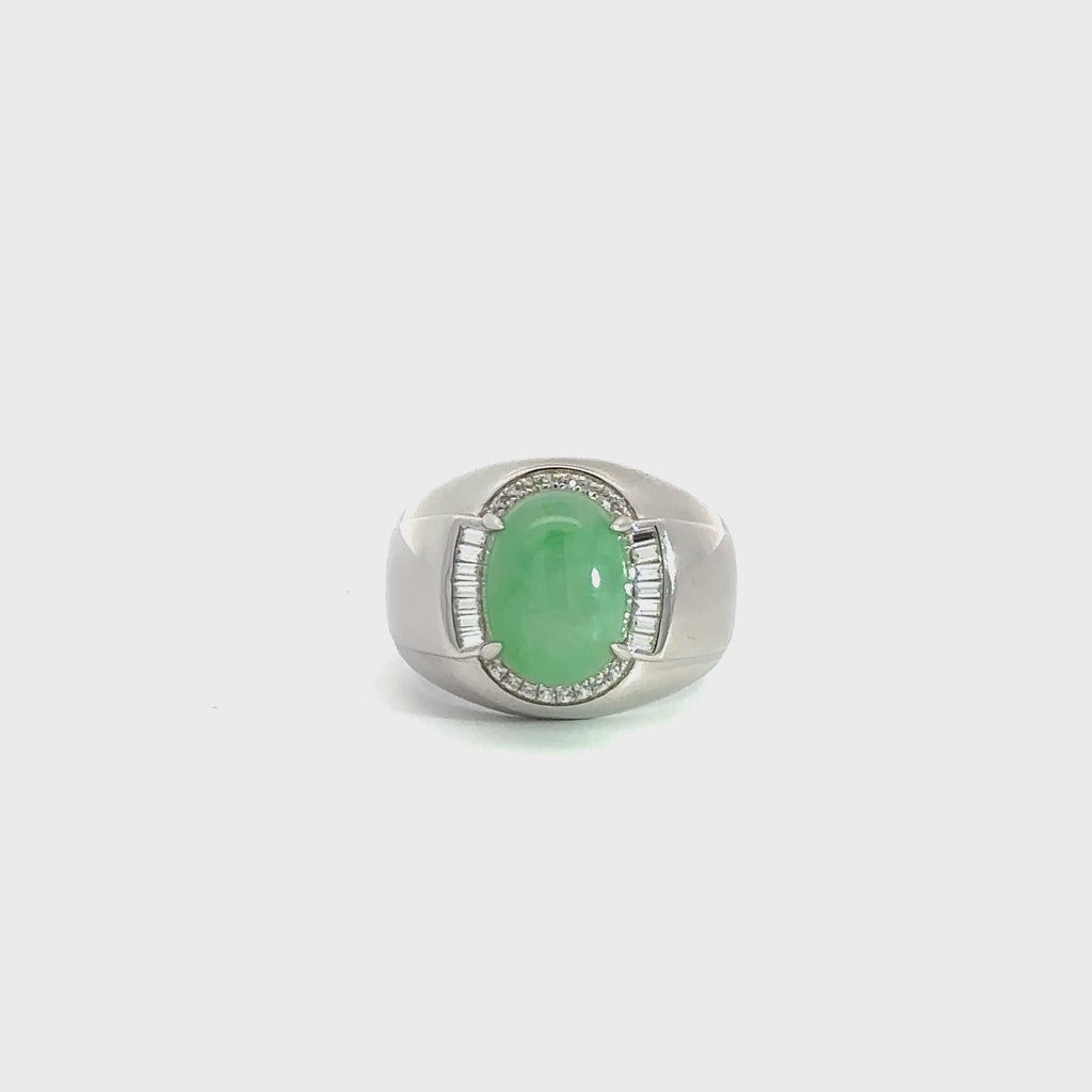 Design concept --- This particular piece features an impressive rich green jadeite jade cabochon stone. Accented with natural diamonds and in a very simplistic design. Crafted for the gentleman, this signet ring marries style and functionality. Elevate your presence and make a statement with this extraordinary jewel, a reflection of your distinguished lifestyle and impeccable taste. It's more than a ring; it's a legacy of luxury and achievement that will be cherished for generations to come.